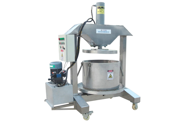 本機由機架、壓緊系統(tǒng)(手輪絲杠或者液壓系統(tǒng))、活動壓板、接汁盤、框欄組成。接汁盤放在底盤上,框欄放在接汁盤上,裝料后將其放入機架的活動壓盤下,物料在活動壓盤的擠壓下榨出汁液。為了提高皮渣芯部的出汁率,在物料之間放有導(dǎo)流盤。汁液由接汁盤收集后經(jīng)出汁管排出。