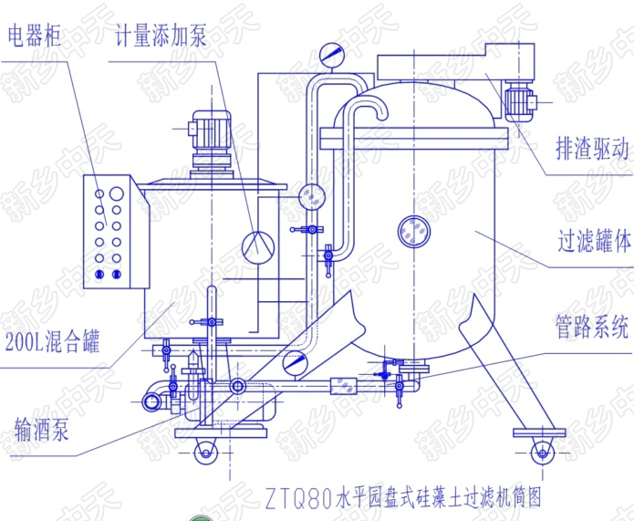 8、本機(jī)所選用的硅藻土添加泵為隔膜式計(jì)量泵,其采用國外技術(shù)生產(chǎn),結(jié)構(gòu)簡(jiǎn)單,計(jì)量精確,且可根據(jù)待濾液的渾濁程度,隨時(shí)調(diào)節(jié)硅藻土等助濾劑的添加量。