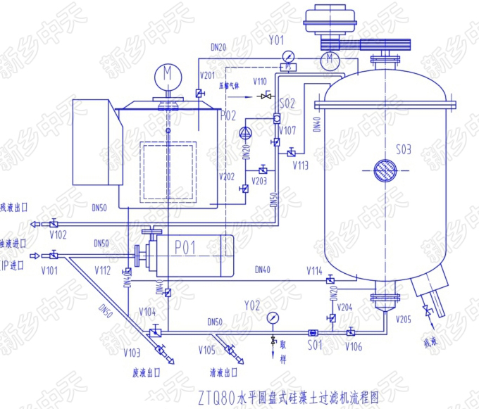 過濾時(shí),首先在過濾盤上形成硅藻土預(yù)涂層。被過濾的液體經(jīng)硅藻土預(yù)涂層時(shí),其中的雜質(zhì)即被阻擋;而純靜的液體經(jīng)過微觀管狀或片狀的間隙以及顆粒之間的間隙通過過濾層,從而起到過濾作用。隨過濾時(shí)間的推移,在預(yù)涂層上被濾掉的雜質(zhì)會(huì)越來越多,且將阻塞過濾通道。因此在過濾過程中,還需對(duì)進(jìn)入過濾罐的被過濾的液體,添加一定劑量相應(yīng)粒度的硅藻土,以維持正常的過濾過程。另外,如果過濾時(shí)需要脫色,還需加入一定比例的活性炭。