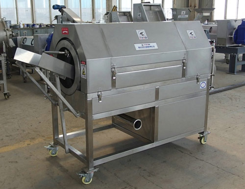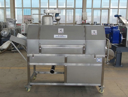 該轉(zhuǎn)篩為內(nèi)篩式過濾,通過篩網(wǎng)上焊接的內(nèi)螺旋不停的轉(zhuǎn)動,逐漸把脫水后的固形物推出去,過濾后的清液經(jīng)轉(zhuǎn)篩外的不銹鋼腔體收集后從管路排出,從而達(dá)到固液分離的目的。